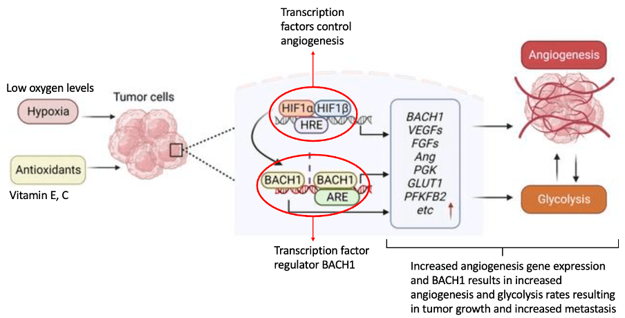 The increased expression of angiogenesis due to antioxidants exposure was seen to increase the number of BACH1 overexpressing cells. The study also found BACH1 levels increased with hypoxia (5). This would result in an increase in glycolysis, resulting in the tumour undergoing metastasis.